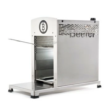 - Anstelle der klassischen Höhenverstellung per Drehknopf verfügt der neue Profi-Beefer über ein Millimeter genaues Einschubraster, das den Rost mit einer einzigen Handbewegung präzise in der gewünschten Höhe aufnimmt. Insbesondere eine solche zeitsparende Funktion haben sich professionelle Köchen explizit von uns gewünscht.