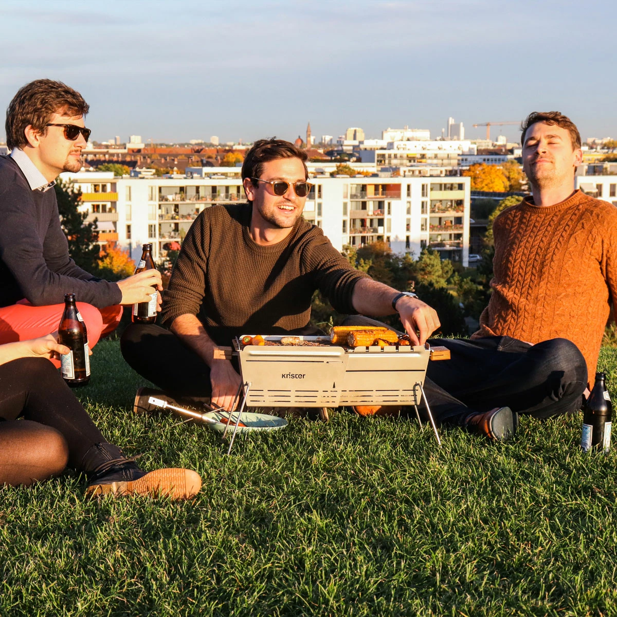 Der tragbare Edelstahlgrill aus dem Sortiment der Münchner Start-up Firma Knister ist das Premium-Modell für jeden, der gerne unterwegs eine spontane Grillmahlzeit genießt. Ob Fahrradtour in den Park, Zelten am Strand oder Urlaub auf Balkonien – der Knister Grill Premium bietet 2 bis 6 Personen hervorragende Grillperformance im kompakten Format.