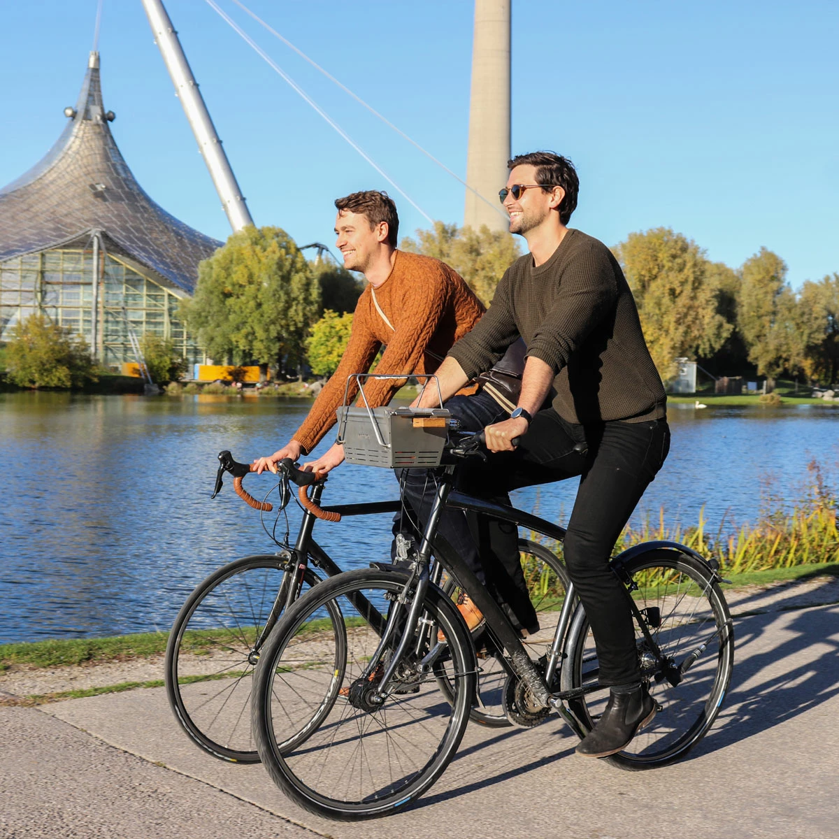 - : Er ist zusammengeschoben mit einer und einem Gewicht von sehr handlich und ein echtes Leichtgewicht in seiner Klasse. Mit den zu Bügeln umgeklappten Standbeinen lässt er sich ganz bequem tragen, während alle Grillutensilien Platz finden. Die optional erhältliche Fahrradhalterung ermöglicht sogar den Transport mit dem Fahrrad oder E-Roller.