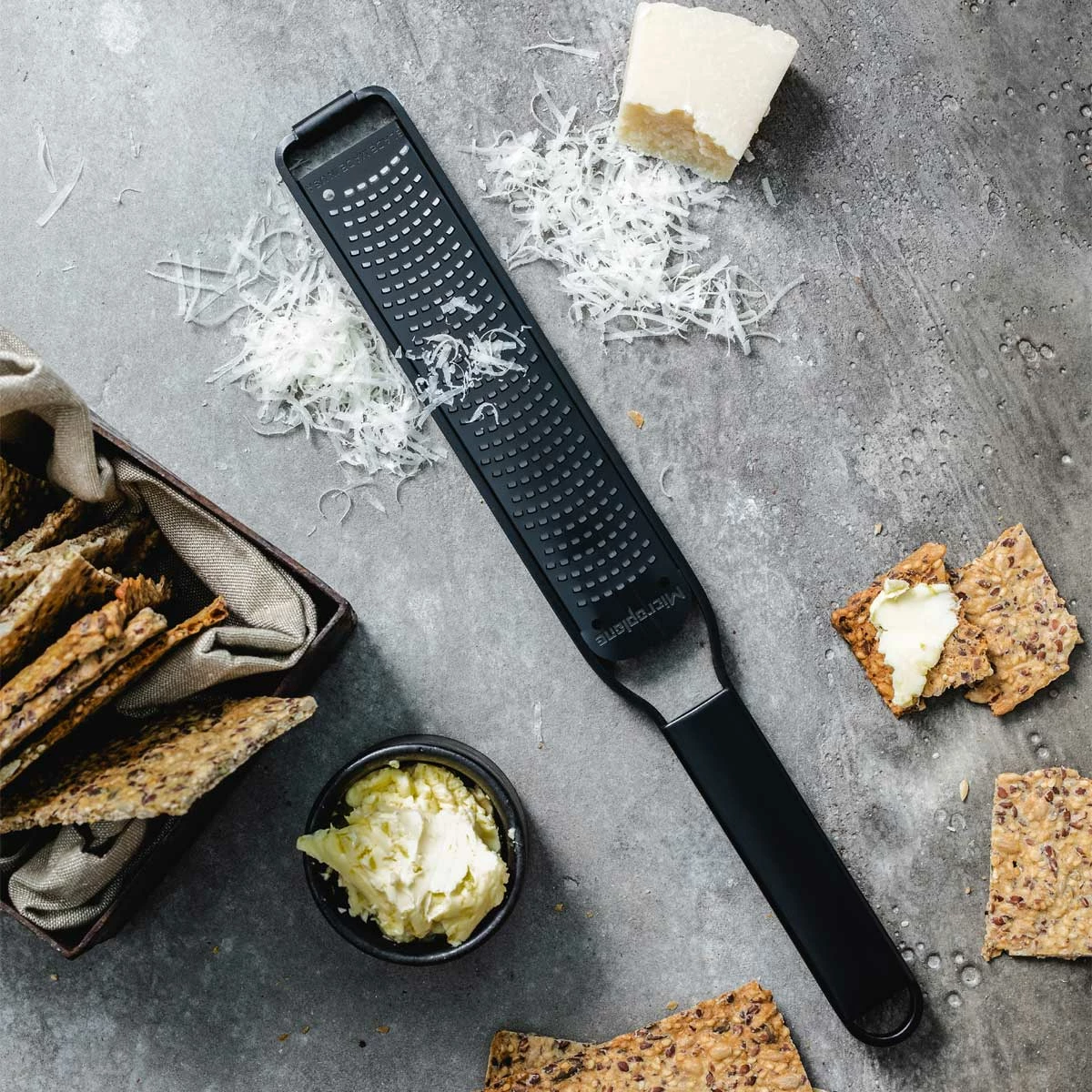 Wer neben höchster Funktionalität auch Wert auf legt, wird an der Microplane Black Sheep Serie seine wahre Freude haben. Vom Griff über den Rahmen bis zur Klinge in schwarze Optik gehüllt, bestechen die Black Sheep Reiben mit ihrem Aussehen. Eine funktionelle sorgt für zusätzliche Kratzfestigkeit.
