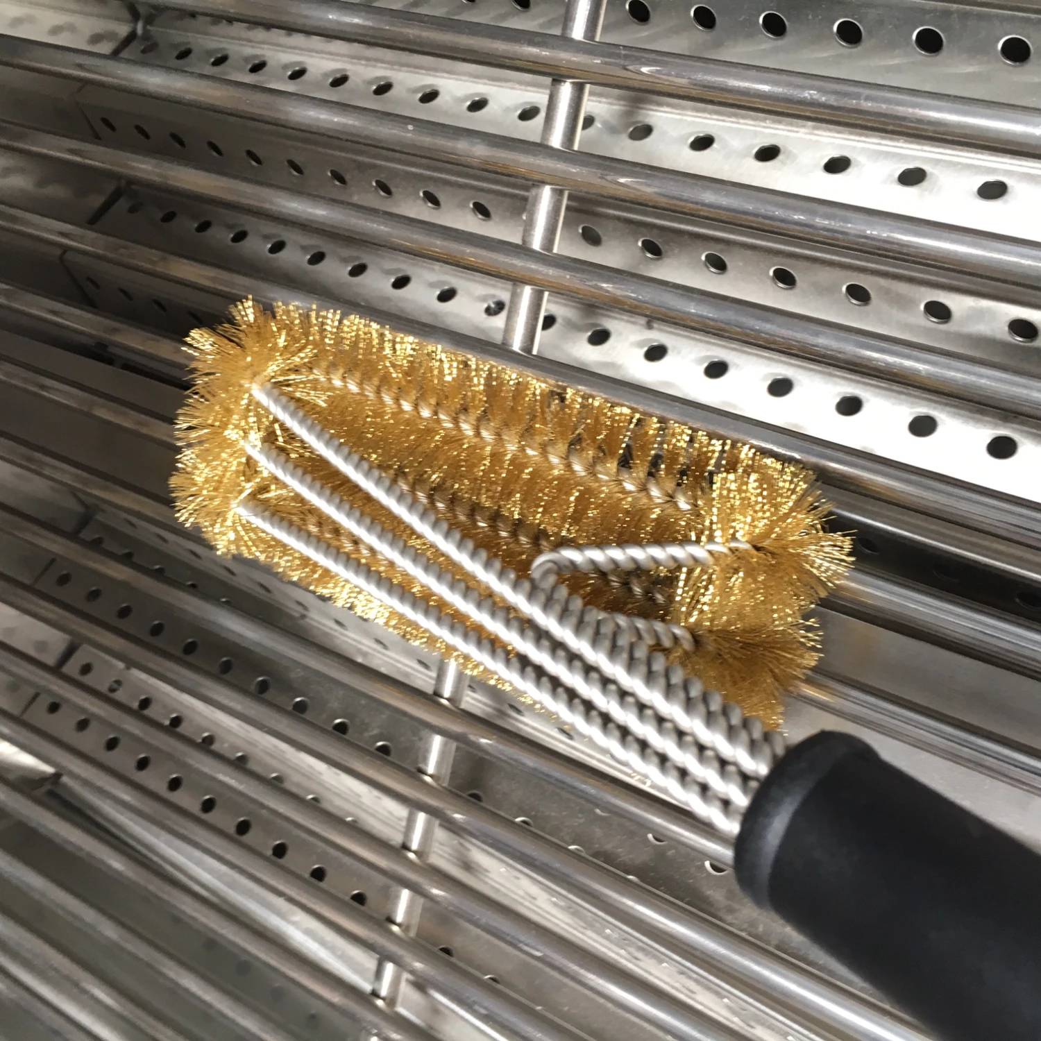 Die SANTOS Premium Grillbürste mit Messingborsten ist universell einsetzbar und beseitigt zuverlässig die Rückstände vom Grillrost. Sie eignet sich vor allem für Oberflächen aus Gusseisen, schont dabei das Material und verursacht keine Schäden durch Zerkratzen. Die stabilen Messingborsten entfernen effektiv hartnäckigste Verschmutzungen, ohne die schützende Patina anzugreifen. Tipp: Bei Grillrosten aus Gusseisen funktioniert das Ausbrennen nach dem Grillen besonders effektiv. Durch die große Hitze im Innenraum verbrennen die Rückstände am Grillrost (Stichwort Pyrolyse) und Grillreste lassen sich dann problemlos mit der Messingbürste wegbürsten. Mit dem extralangen Griff behaltet Ihr eine