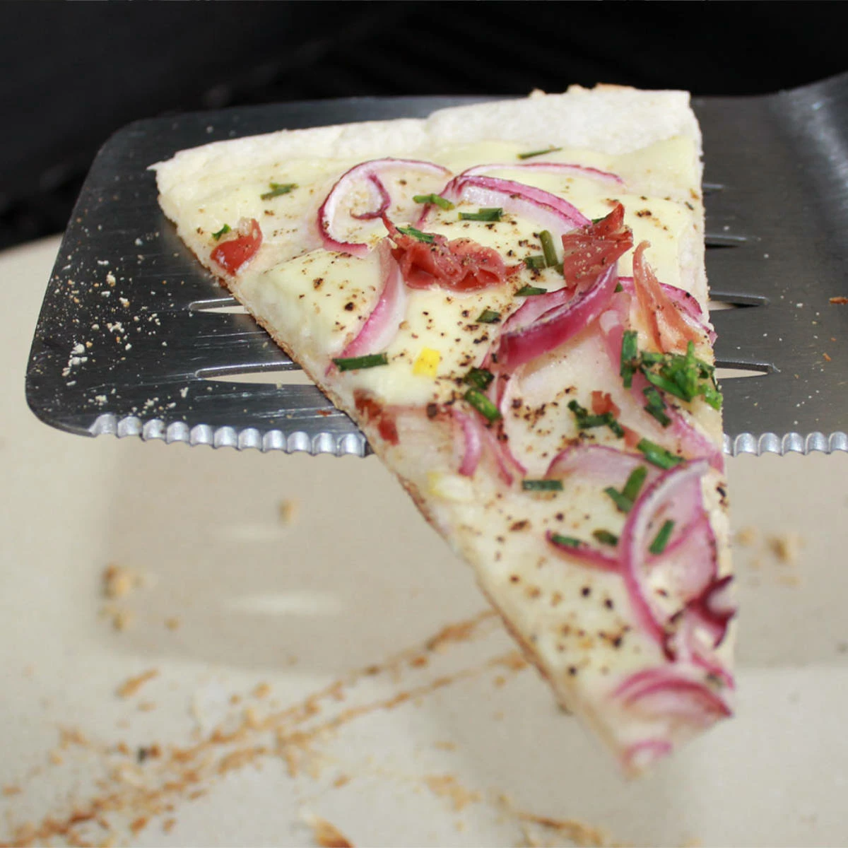 - Der ist mit seinem breiten Spatel das perfekte Werkzeug, um Burger, Fisch, Spiegelei und Grillkäse zu wenden und zu servieren. Die seitliche Zahnung erlaubt schnelles Schneiden und Zer