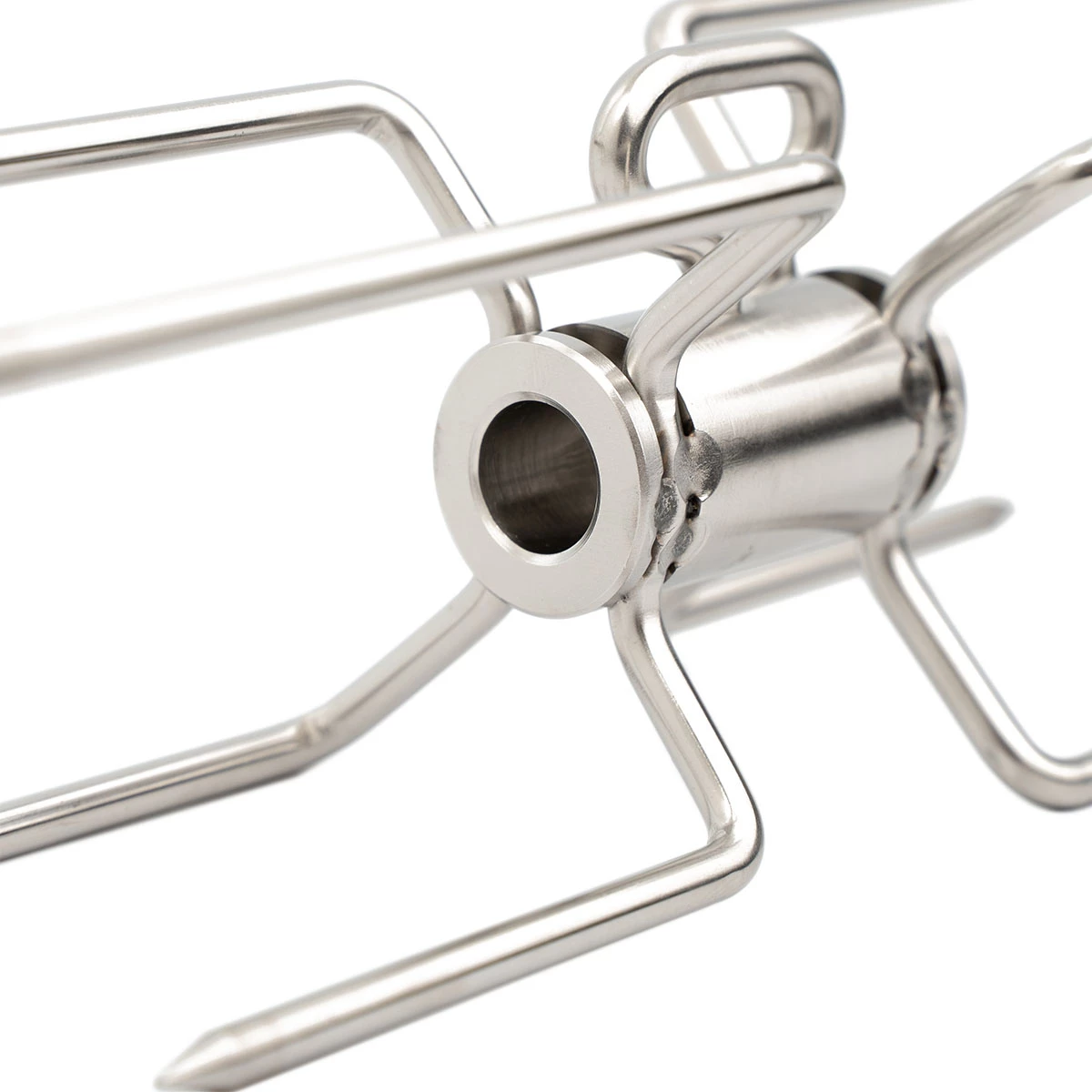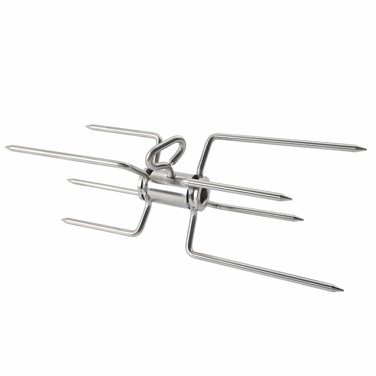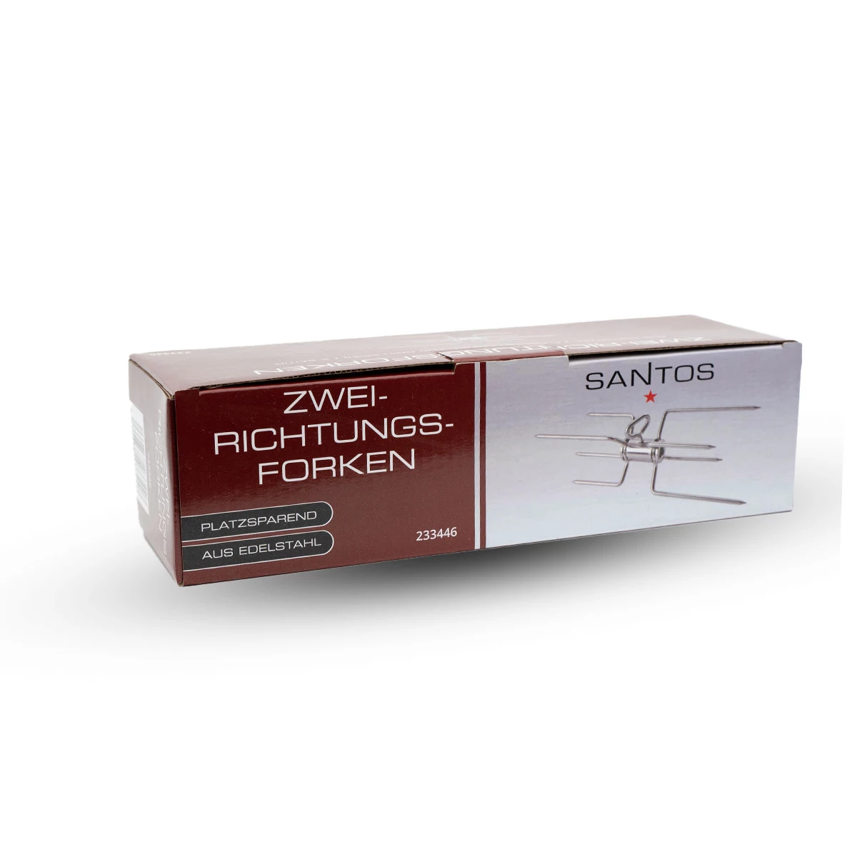 Mit der von SANTOS habt Ihr schnell Abhilfe geschafft und könnt den Platz auf dem Drehspieß optimal nutzen. Während die beiden zum Spieß gehörigen Fleischklammern das Grillgut von außen befestigen, fungiert die Doppelforke als und fixiert die beiden Fleischstücke in der Mitte.
