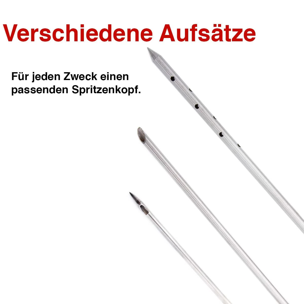 Die verschiedenen Nadeln lassen sich mühelos wechseln und auf den Kolben verschrauben. Die geschlossene Nadel mit 12 Löchern eignet sich für dünnflüssige Marinaden, die gleichmäßig auch in großen Fleischstücken verteilt werden. Rubs und dickflüssige Marinaden könnt Ihr mit der 5mm-Fleischnadel mühelos in das Fleisch einbringen. Die beiden 3mm-Nadeln eignen sich besonders für kleines oder flaches Grillgut, wie z.B. Schweinefilet, Steaks oder Fisch.