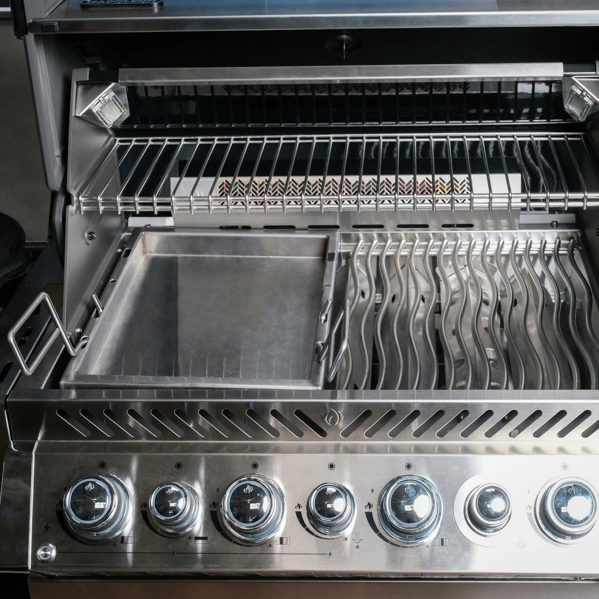 - Es darf niemals die gesamte Grillfläche mit Steakplatten und/oder Einsatzpfannen belegt werden, da ansonsten die Gefahr eines Hitzestaus besteht bzw. es durch Ersticken der Grillflamme zu Austritt von unverbranntem Gas kommen kann.