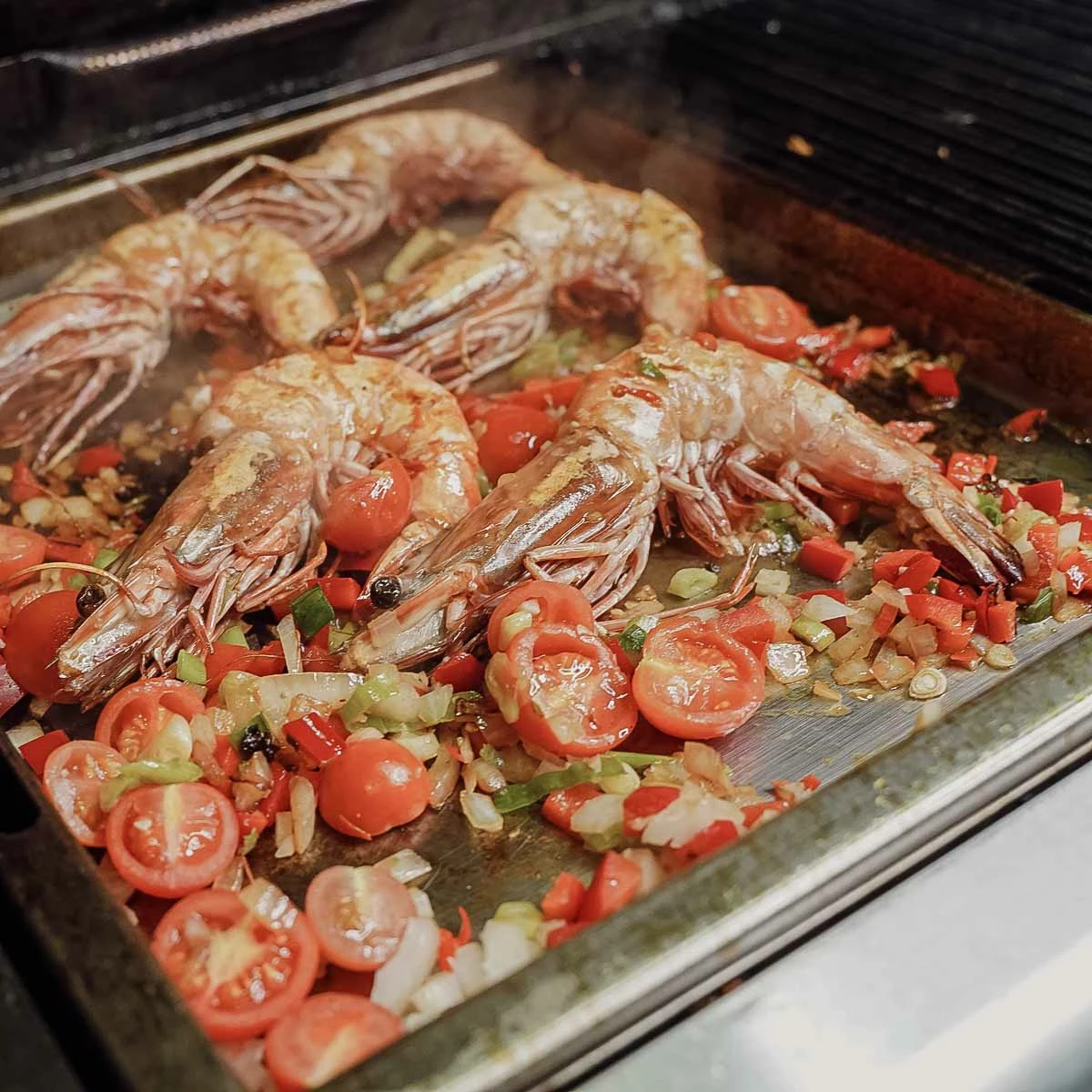 Mit den praktischen Griffen einfach, schnell und sicher auf dem Grill platziert, bieten sich fast unerschöpfliche Möglichkeiten. Neben Reibekuchen, Bratkartoffeln, Rührei und anderen typischen Pfannengerichten gelingen auch vielfältige Fisch- und Gemüserezepte sowie Aufläufe und Gratins. Ihr wolltet schon immer grillen wir Euer Lieblings-Japaner? Die SANTOS Einsatzpfanne lässt sich zur Zubereitung von asiatischen Grillgerichten kurzerhand als Teppanyaki-Grillplatte verwenden. Auch für mediterranes Grillvergnügen ist sie perfekt geeignet, denn Ihr könnt sie wie eine Plancha nutzen und unwiderstehliche Gerichte mit Gemüse und Schalentieren zubereiten. Exotische Garnelen, spanische Paella oder deftiges Bratengericht – die SANTOS Einsatzpfanne bringt Eure kulinarischen Höhepunkte auf den Grill.