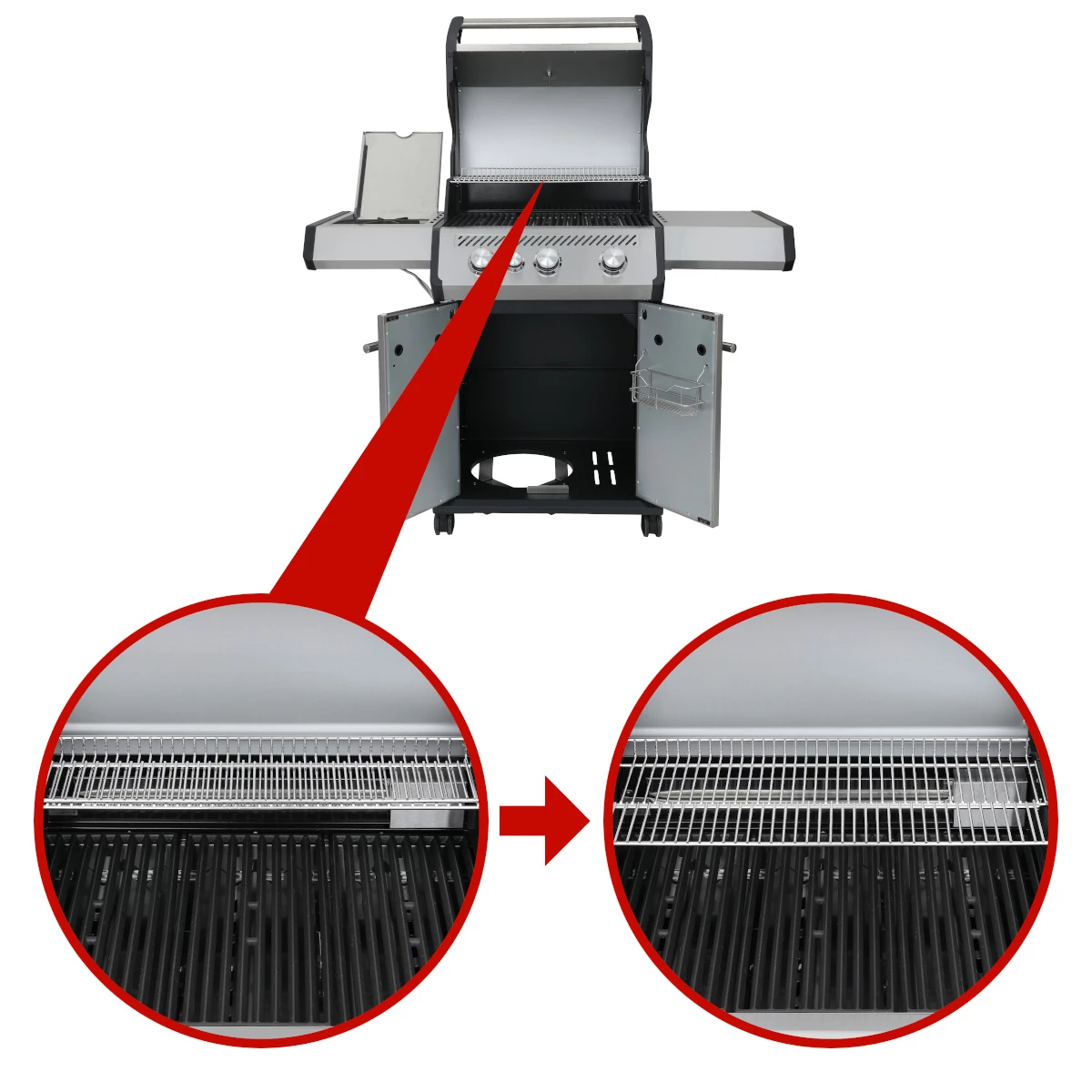 Die Seitenablagen verfügen über Haken, an denen Ihr das Grillzubehör wie z.B. oder aufhängen könnt. Zusätzlich ist die rechte Seitenablage durch einfaches Heben nach unten einklappbar. Damit schafft Ihr schnell Platz und der Grill kann einfacher positioniert oder verstaut werden.
