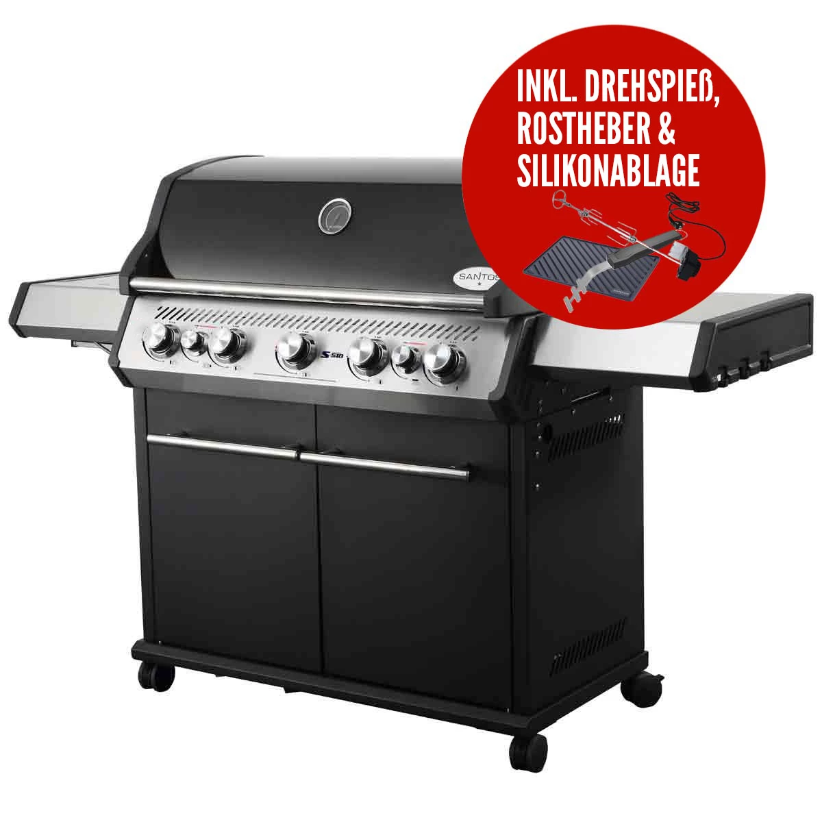 Der S-518 lässt sich mit dem passenden Zubehör von SANTOS zur All Inclusive Außenküche aufrüsten. Von den Basics wie Grillbesteck, Grillhandschuhe und Abdeckhaube bis hin zur Drehspieß, Gusspfanne, Plancha und BBQ-Thermometer findet Ihr im SANTOS Zubehör funktional und clevere Extras, die Euch begeistern werden!