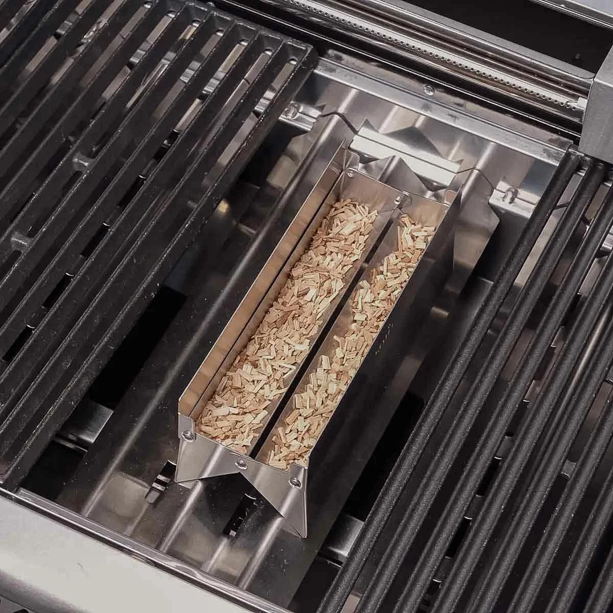 Die gefüllte Räucherbox wird platzsparend direkt auf den Waves (Flammverteiler) Eures Gasgrills positioniert – so bleibt auf dem Grillrost mehr Platz für Euer wertvolles Grillgut.
