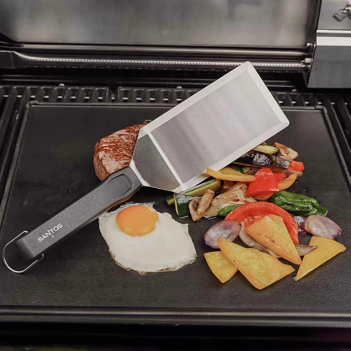 Die SANTOS BBQ-Spachtel aus gebürstetem Edelstahl sind das optimale Werkzeug, wenn Ihr gerne Hamburger grillt oder Leckeres auf der Grillplatte zubereitet. Ideal zum Wenden und Servieren von Bratgut, welches sonst zerfallen könnte – damit habt Ihr den perfekten Dreh für Burger Patties & Co und alles, was bei Euch auf Plancha- und Teppanyaki-Grillplatten kommt. Für den richtigen Grip sorgen abgeflachte Kanten, eine große Spachtel-Fläche sowie Griffe aus Kunststoff. Mit praktischen Aufhängern.