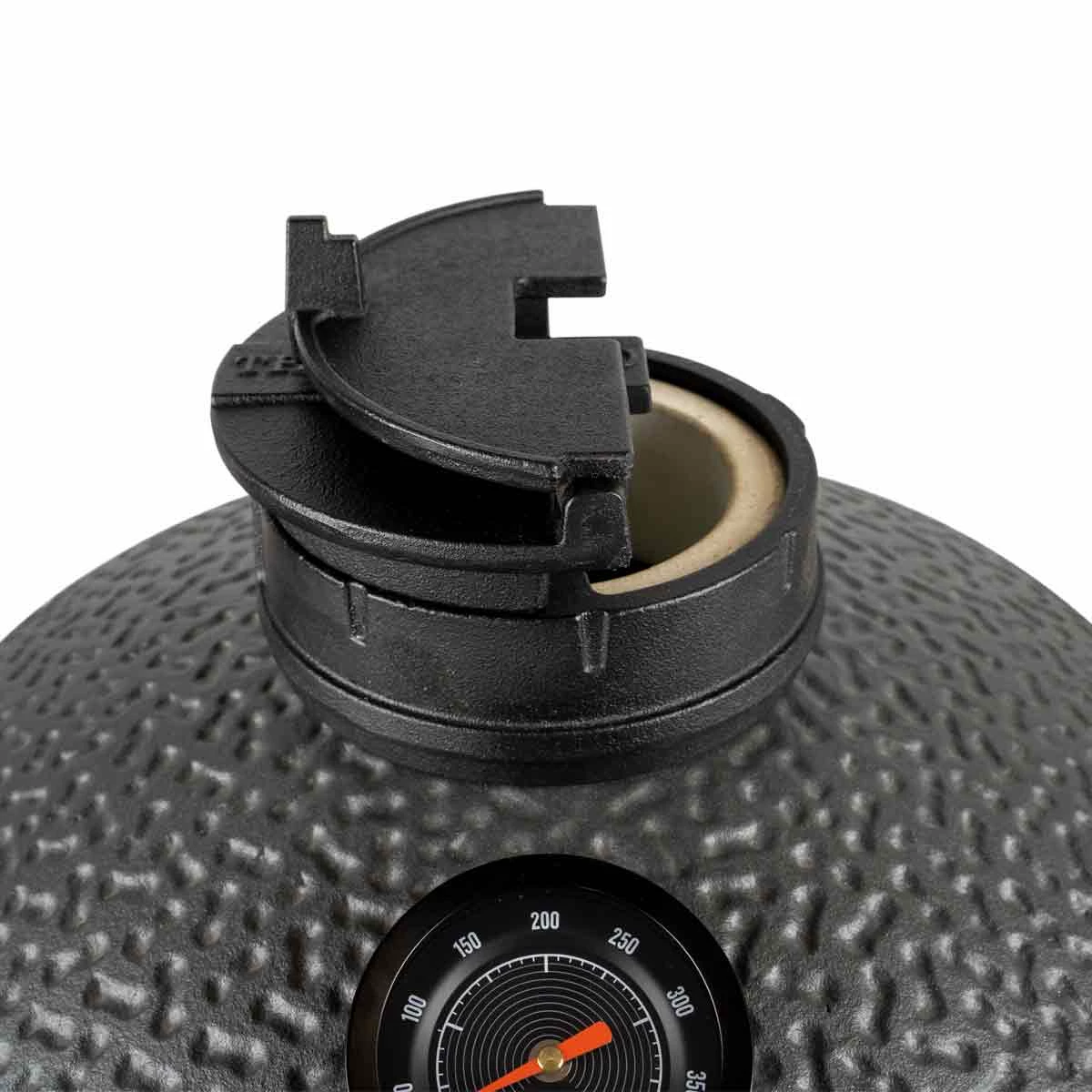 - Der neu designte am Boden des Grillkörpers ist mit seiner doppelten Schiebetür noch präziser, so dass Ihr die Temperatur im Inneren des Keramikgrills optimal kontrollieren könnt. Der Schieber passt mit seiner schönen schwarzen Oberfläche auch optisch perfekt.